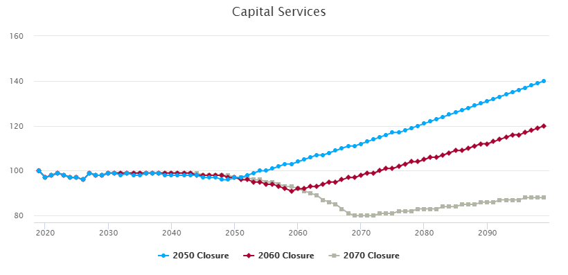 This stabilization is achieved by assuming that a change in policy (the “closure rule”) occurs in 2050 to maintain stabilization. There are a variety of different potential closure rules that could be used to achieve this stabilization. Because capital market participants are forward-looking, the exact choice of closure rule has an impact on the analysis of the economy even before 2050.