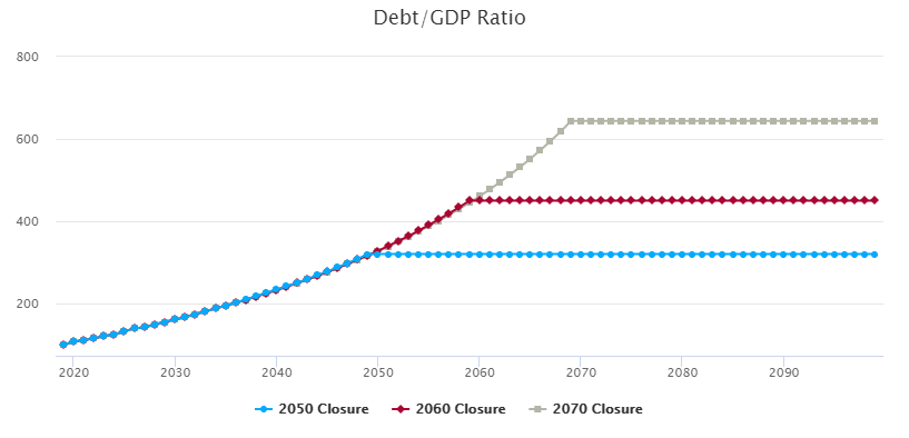To assess the importance of the choice of the closure year, Table 1 shows the debt-to-GDP ratio over time for three different choices of closure years under present law: 2050, 2060, and 2070. Consistently, the later the choice of closure year, the larger the debt that is allowed to accumulate relative to GDP.